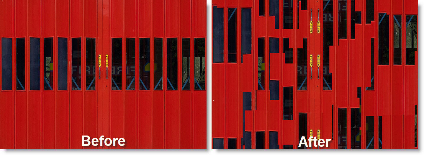 Applies a collection of 3d refracting glass strips to break up the image, while the image is shifted within each strip.