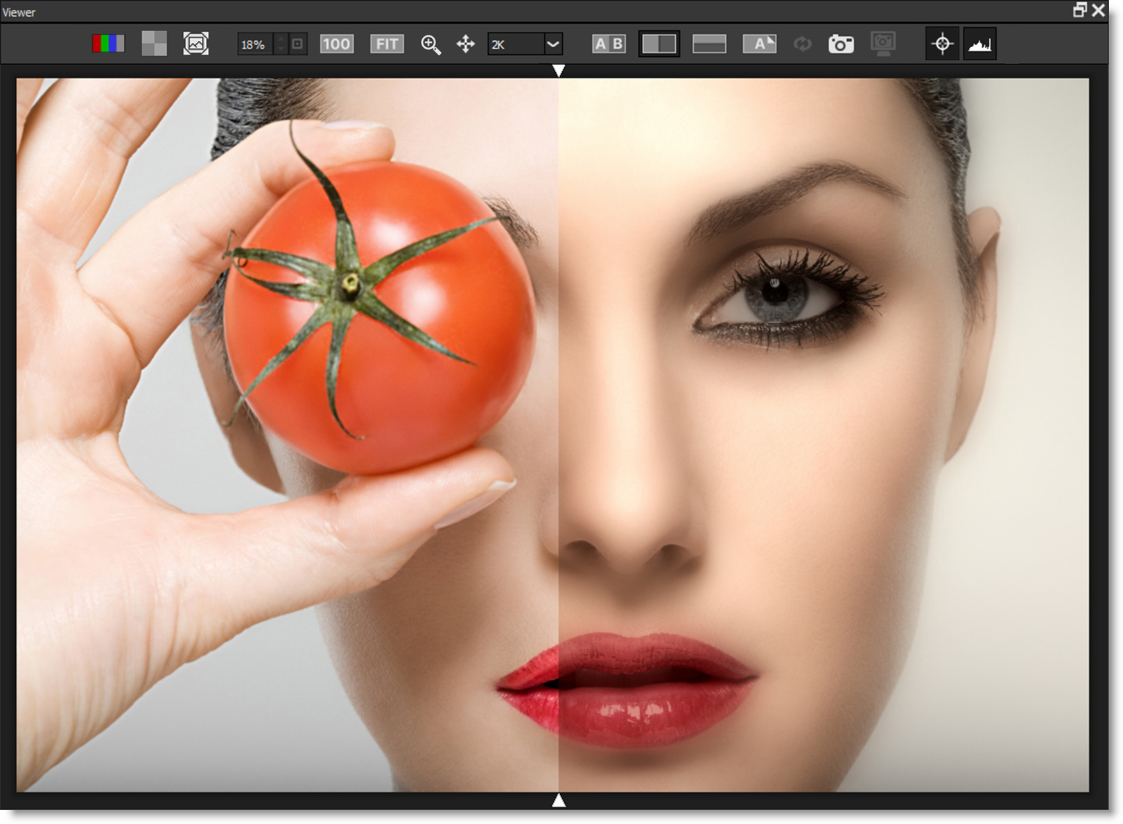 Optics can compare layers using Side-by-Side, Vertical Split, Horizontal Split, A/B or Snapshot comparison modes. By default, the current filter and original image are selected for comparison.