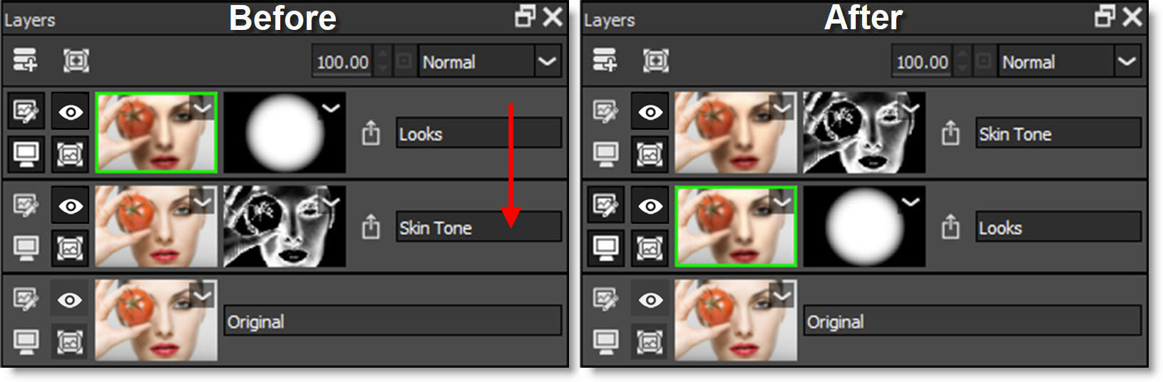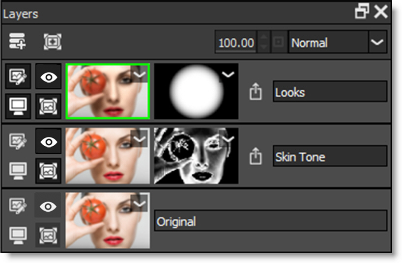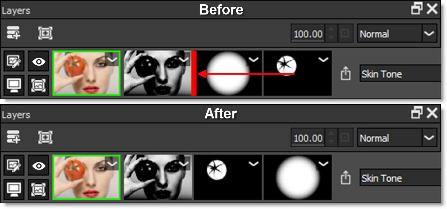 Enables/Disables the filter, masks, Blend Mode and Opacity. A red X appears on the image and mask thumbnails when disabled.