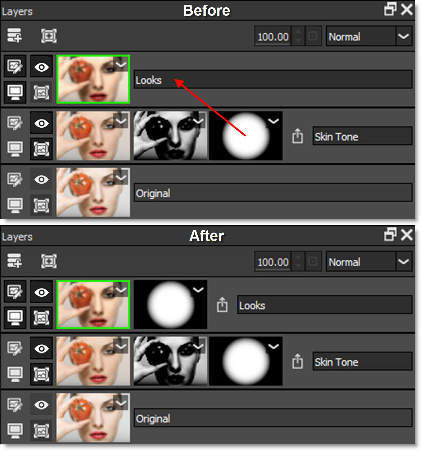 • Photoshop: A layer mask is present.