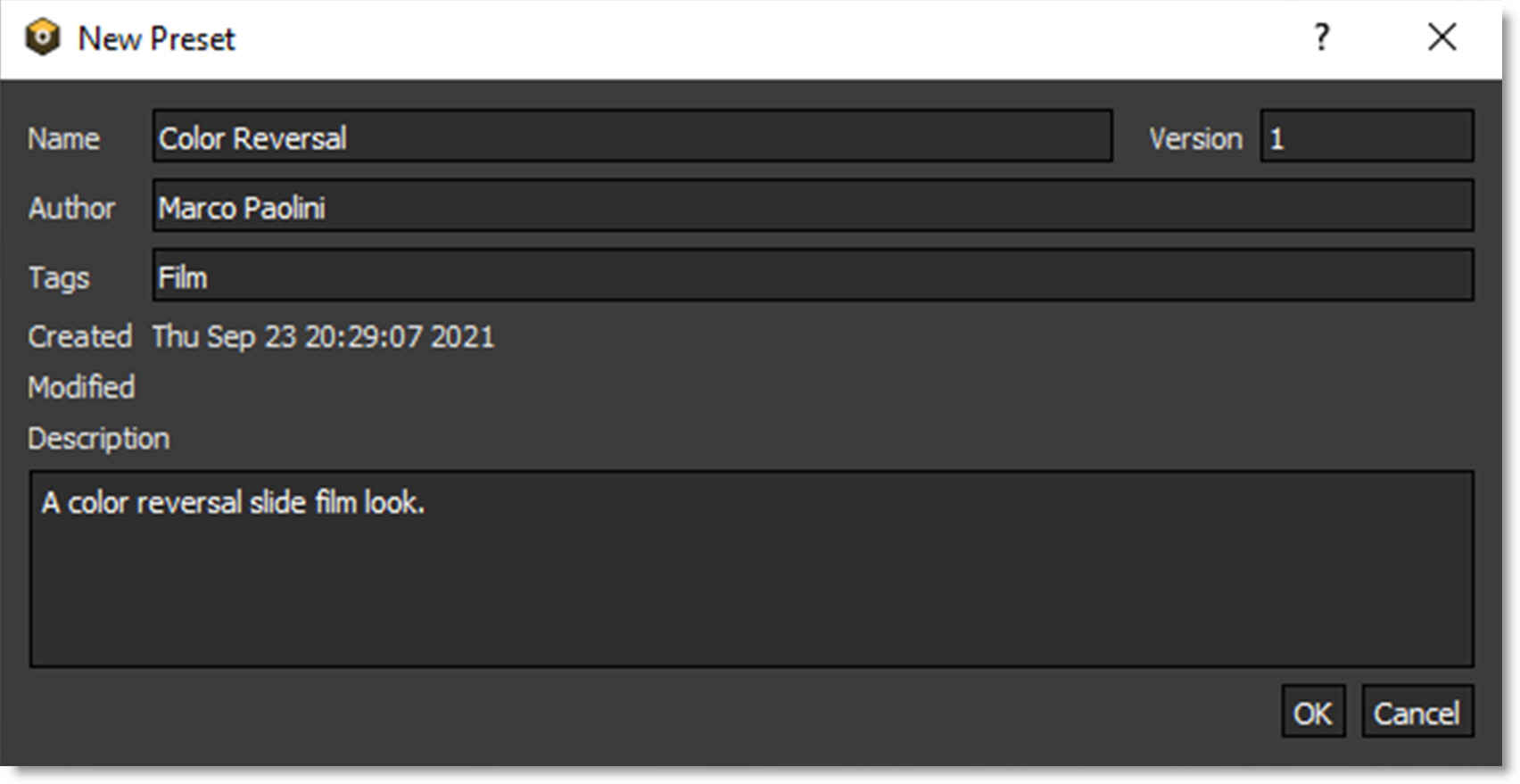 To create a new preset, click the Create Custom Preset icon and when the New Preset window opens, enter the desired information and press OK to create the preset.